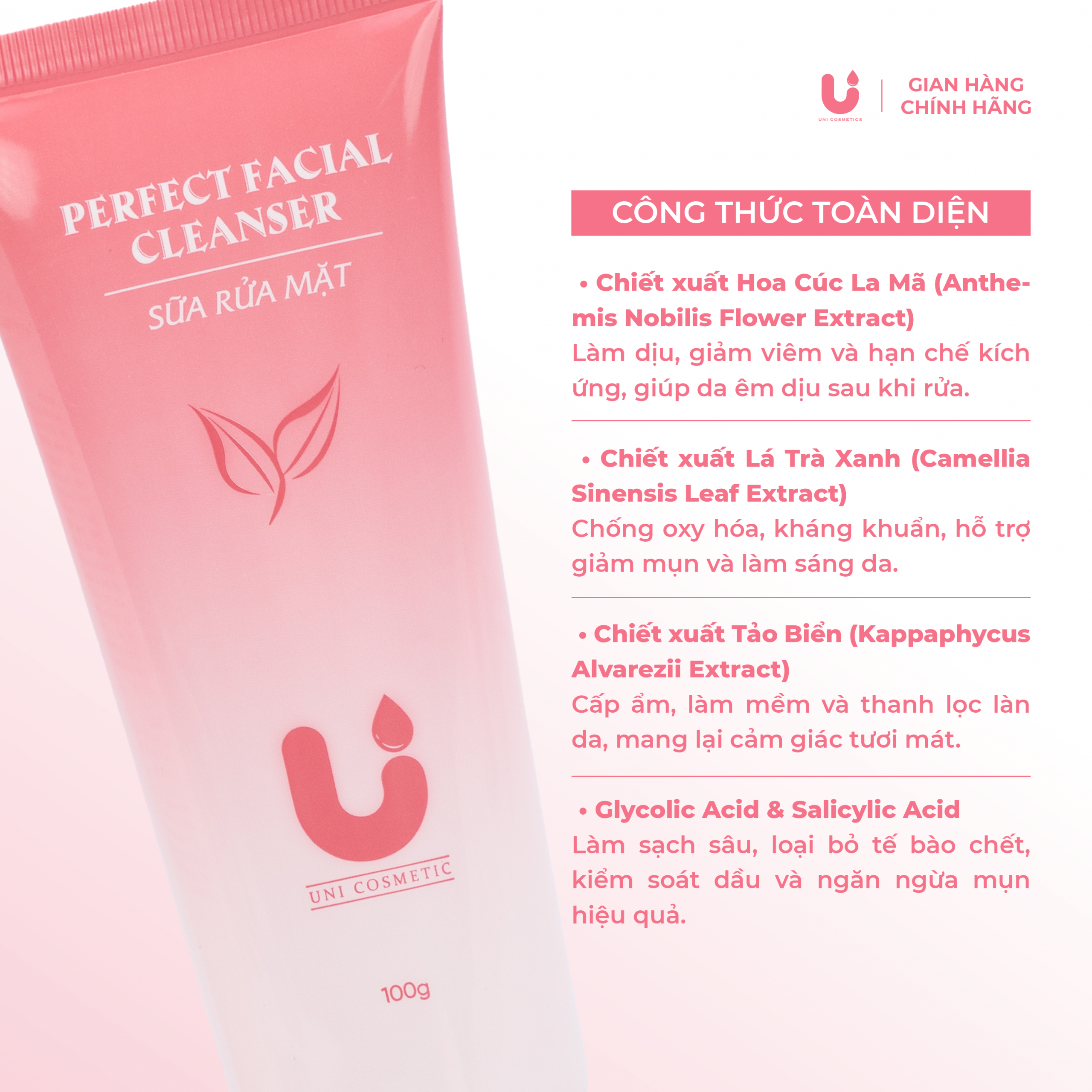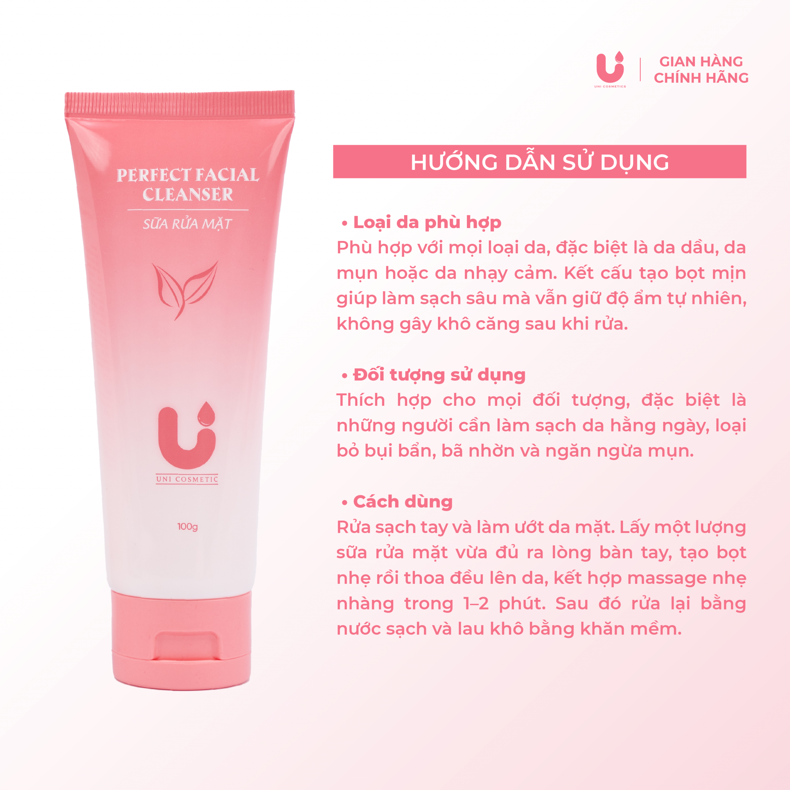 Sữa rửa mặt Unicosmetic giúp làm sạch bụi bẩn, dầu thừa và tế bào chết, mang lại làn da sáng mịn, thông thoáng mỗi ngày.
